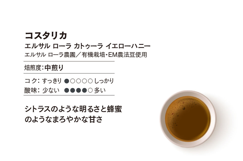 苦みは少なく、すっきりとした酸味があり、豆によってはフルーティな風味が味わえる。